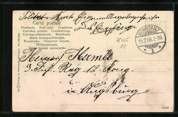 alte Ansichtskarte, gelaufen 1908 als Feldpost, Eckknick re. oben, Stempelspur, guter Zustand