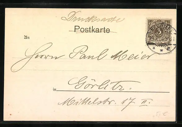 Personenbezogene Daten auf der Rückseite der Karte wurden durch blauen Textmarker unkenntlich gemacht. Die blauen Stellen sind auf die Vorderseite durchgeweicht und wirken sich negativ auf das Postkartenfoto aus
