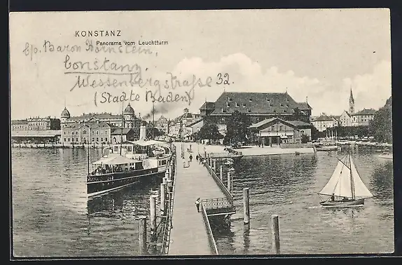 AK Konstanz, Panorama vom Leuchtturm mit Dampfer