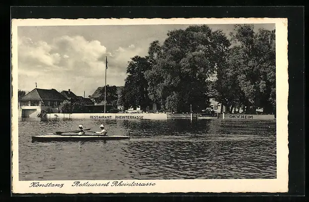 AK Konstanz, Restaurant Rheinterrasse mit Ruderboot