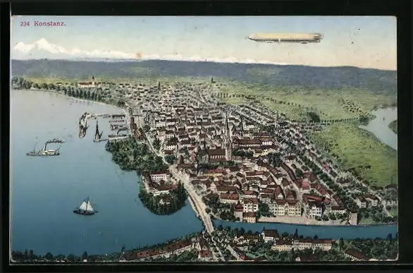 AK Konstanz, Teilansicht mit Luftschiff Zeppelin