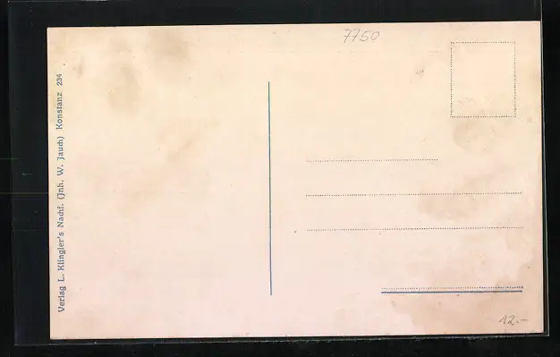 Personenbezogene Daten auf der Rückseite der Karte wurden durch blauen Textmarker unkenntlich gemacht. Die blauen Stellen sind auf die Vorderseite durchgeweicht und wirken sich negativ auf das Postkartenfoto aus