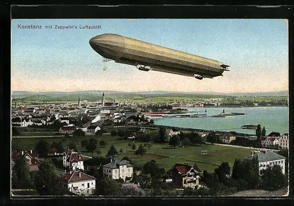 AK Konstanz, Totalansicht mit Zeppelin`schem Luftschiff