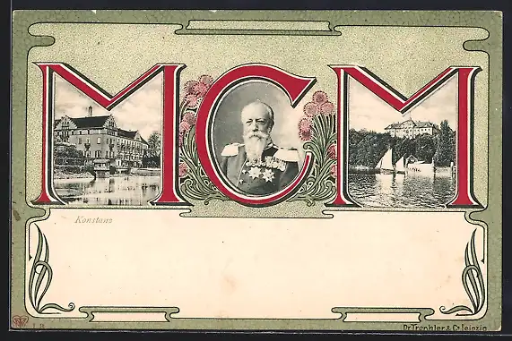 AK Konstanz, Uferpartie, Portrait und Schloss im Schriftzug MCM