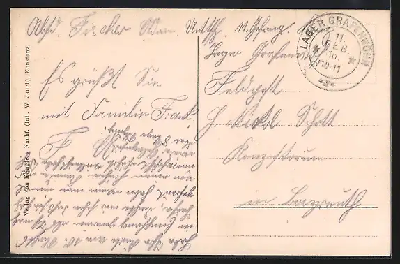 Personenbezogene Daten auf der Rückseite der Karte wurden durch blauen Textmarker unkenntlich gemacht. Die blauen Stellen sind auf die Vorderseite durchgeweicht und wirken sich negativ auf das Postkartenfoto aus