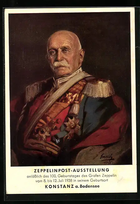 AK Konstanz, Zeppelinpost-Ausstellung 1938, Graf Zeppelin in Uniform zu seinem 100. Geburtstag