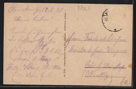 Personenbezogene Daten auf der Rückseite der Karte wurden durch blauen Textmarker unkenntlich gemacht. Die blauen Stellen sind auf die Vorderseite durchgeweicht und wirken sich negativ auf das Postkartenfoto aus