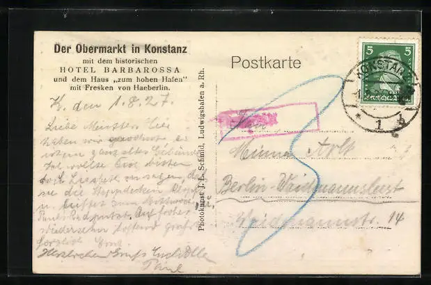 Personenbezogene Daten auf der Rückseite der Karte wurden durch blauen Textmarker unkenntlich gemacht. Die blauen Stellen sind auf die Vorderseite durchgeweicht und wirken sich negativ auf das Postkartenfoto aus