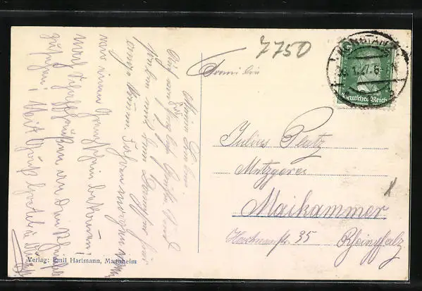 Personenbezogene Daten auf der Rückseite der Karte wurden durch blauen Textmarker unkenntlich gemacht. Die blauen Stellen sind auf die Vorderseite durchgeweicht und wirken sich negativ auf das Postkartenfoto aus