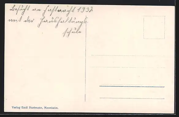 Personenbezogene Daten auf der Rückseite der Karte wurden durch blauen Textmarker unkenntlich gemacht. Die blauen Stellen sind auf die Vorderseite durchgeweicht und wirken sich negativ auf das Postkartenfoto aus