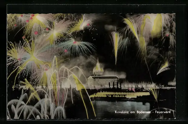 AK Konstanz am Bodensee, Uferpartie mit Feuerwerk