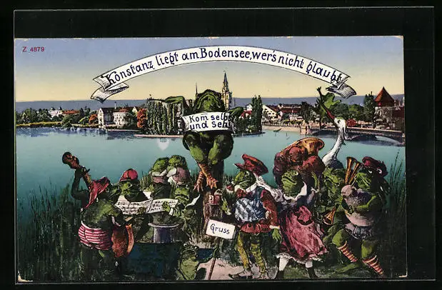 AK Konstanz am Bodensee, Uferpartie mit musizierenden Fröschen