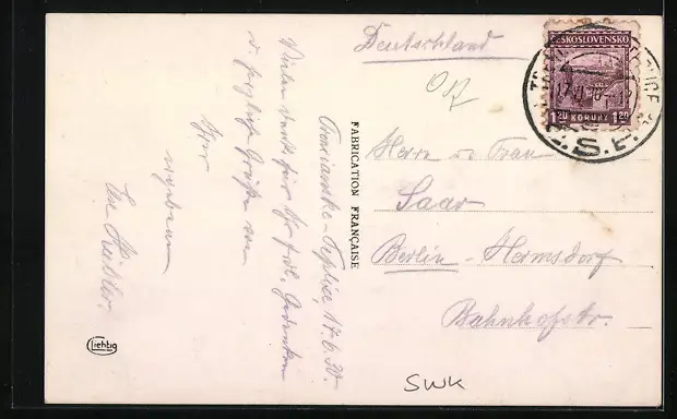 Personenbezogene Daten auf der Rückseite der Karte wurden durch blauen Textmarker unkenntlich gemacht. Die blauen Stellen sind auf die Vorderseite durchgeweicht und wirken sich negativ auf das Postkartenfoto aus