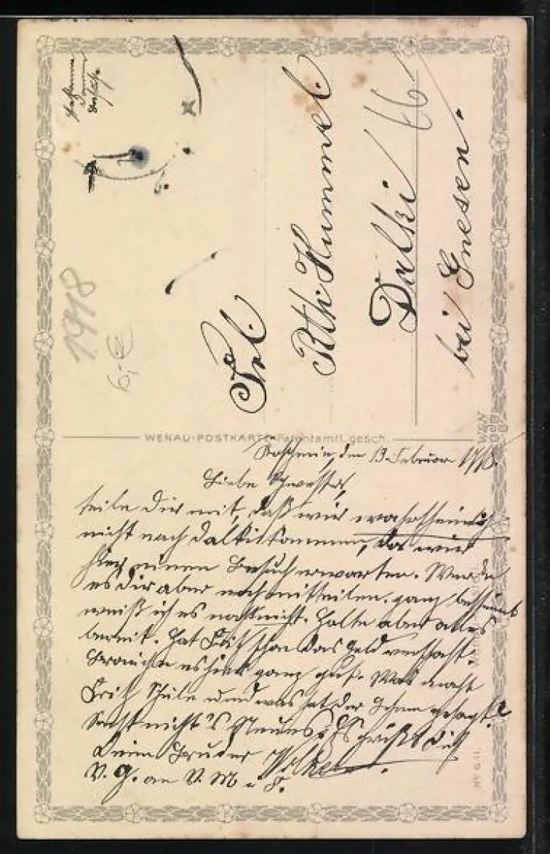 Personenbezogene Daten auf der Rückseite der Karte wurden durch blauen Textmarker unkenntlich gemacht. Die blauen Stellen sind auf die Vorderseite durchgeweicht und wirken sich negativ auf das Postkartenfoto aus