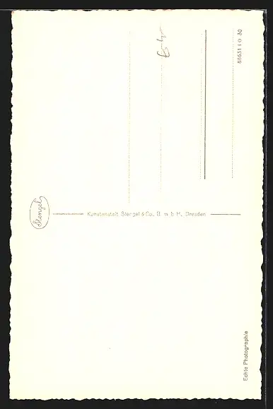 Personenbezogene Daten auf der Rückseite der Karte wurden durch blauen Textmarker unkenntlich gemacht. Die blauen Stellen sind auf die Vorderseite durchgeweicht und wirken sich negativ auf das Postkartenfoto aus