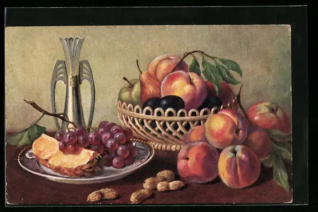 AK Korb mit Pfirsichen, Äpfeln und Pflaumen, Obst