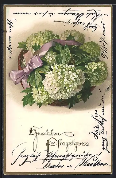 AK Korb mit weissen Blüten und Schleife, Pfingstgruss