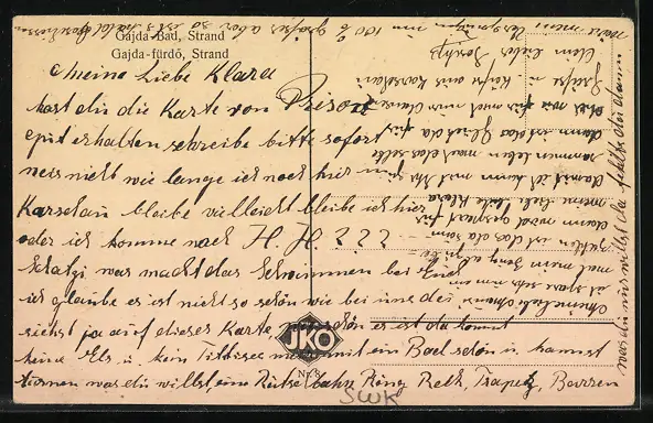 Personenbezogene Daten auf der Rückseite der Karte wurden durch blauen Textmarker unkenntlich gemacht. Die blauen Stellen sind auf die Vorderseite durchgeweicht und wirken sich negativ auf das Postkartenfoto aus