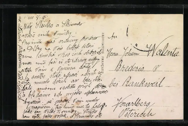 Personenbezogene Daten auf der Rückseite der Karte wurden durch blauen Textmarker unkenntlich gemacht. Die blauen Stellen sind auf die Vorderseite durchgeweicht und wirken sich negativ auf das Postkartenfoto aus
