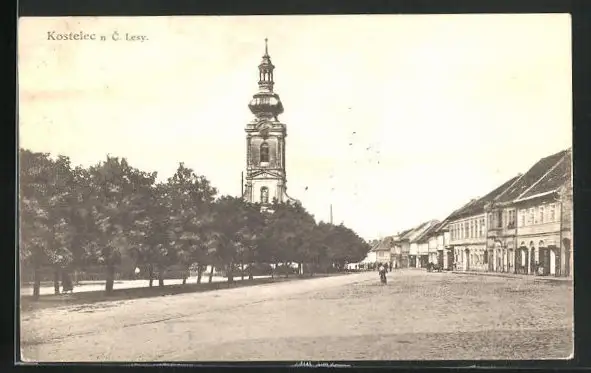 AK Kostelec n. C. Lesy, Hauptplatz mit Kirchturm