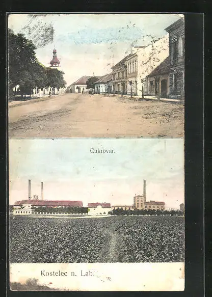 AK Kostelec n. Lab., Cukrovar, Strassenpartie mit Kirche