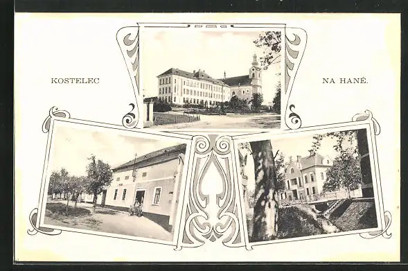 AK Kostelec na Hané, Strassenpartie, Blick zur Kirche