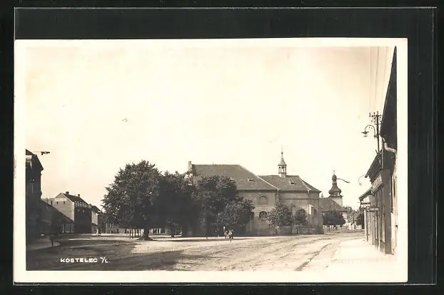 AK Kostelec nad Labem, Strassenpartie mit Blick zur Kirche