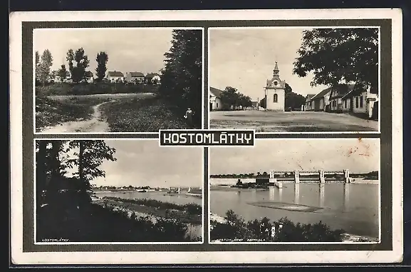 AK Kostomlatky, Kirche, Uferpartie, Ortspartie