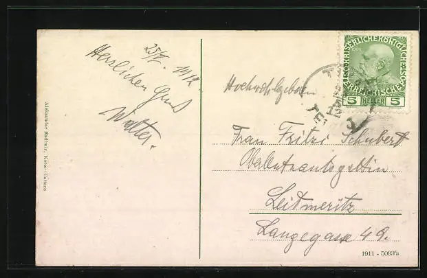 Personenbezogene Daten auf der Rückseite der Karte wurden durch blauen Textmarker unkenntlich gemacht. Die blauen Stellen sind auf die Vorderseite durchgeweicht und wirken sich negativ auf das Postkartenfoto aus