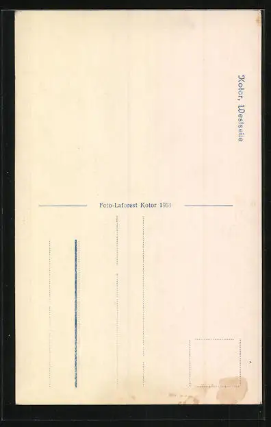 Personenbezogene Daten auf der Rückseite der Karte wurden durch blauen Textmarker unkenntlich gemacht. Die blauen Stellen sind auf die Vorderseite durchgeweicht und wirken sich negativ auf das Postkartenfoto aus