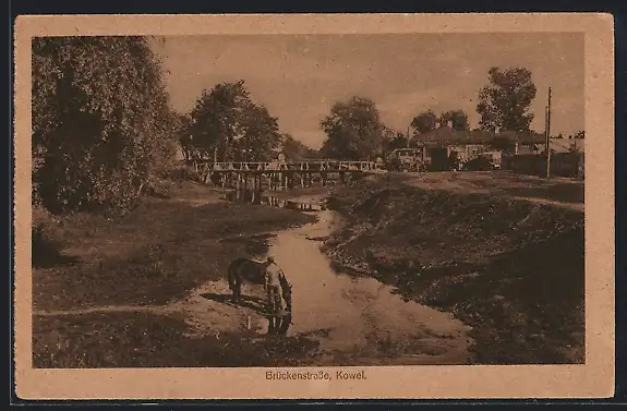 AK Kowel, Brückenstrasse, Flussartie mit trinkendem Pferd
