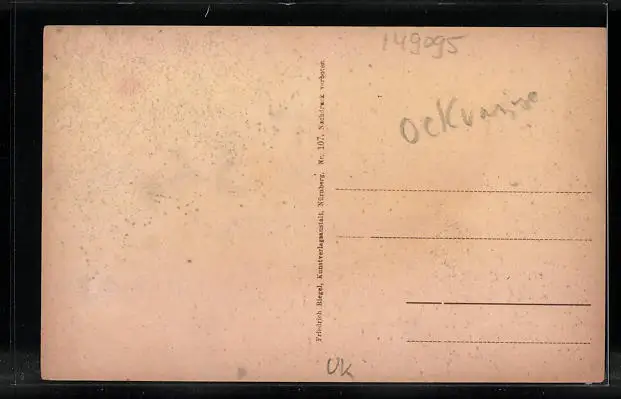 Personenbezogene Daten auf der Rückseite der Karte wurden durch blauen Textmarker unkenntlich gemacht. Die blauen Stellen sind auf die Vorderseite durchgeweicht und wirken sich negativ auf das Postkartenfoto aus