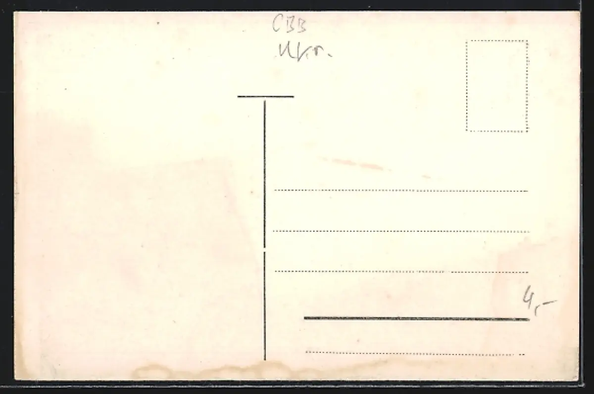 Personenbezogene Daten auf der Rückseite der Karte wurden durch blauen Textmarker unkenntlich gemacht. Die blauen Stellen sind auf die Vorderseite durchgeweicht und wirken sich negativ auf das Postkartenfoto aus