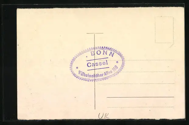 Personenbezogene Daten auf der Rückseite der Karte wurden durch blauen Textmarker unkenntlich gemacht. Die blauen Stellen sind auf die Vorderseite durchgeweicht und wirken sich negativ auf das Postkartenfoto aus