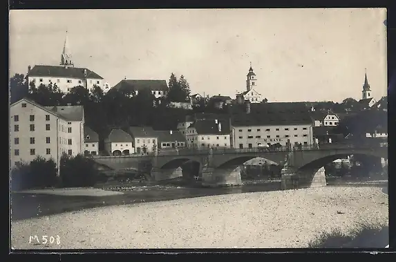 Personenbezogene Daten auf der Rückseite der Karte wurden durch blauen Textmarker unkenntlich gemacht. Die blauen Stellen sind auf die Vorderseite durchgeweicht und wirken sich negativ auf das Postkartenfoto aus