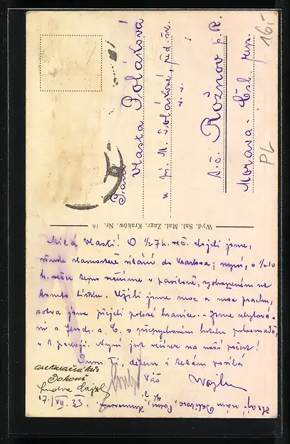 Personenbezogene Daten auf der Rückseite der Karte wurden durch blauen Textmarker unkenntlich gemacht. Die blauen Stellen sind auf die Vorderseite durchgeweicht und wirken sich negativ auf das Postkartenfoto aus