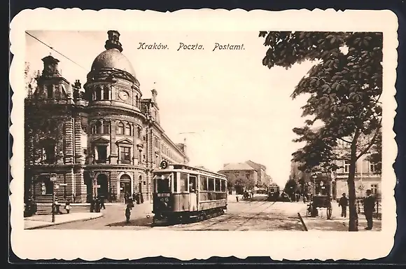 AK Krakow, Poczta, Strassenbahn am Postamt
