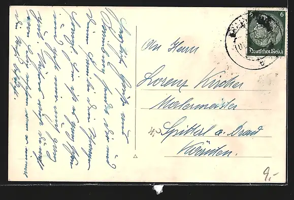 Personenbezogene Daten auf der Rückseite der Karte wurden durch blauen Textmarker unkenntlich gemacht. Die blauen Stellen sind auf die Vorderseite durchgeweicht und wirken sich negativ auf das Postkartenfoto aus