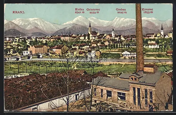 AK Kranj, Ortsansicht von Fabrikgelände aus, gegen die Berge