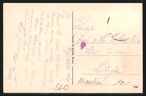 Personenbezogene Daten auf der Rückseite der Karte wurden durch blauen Textmarker unkenntlich gemacht. Die blauen Stellen sind auf die Vorderseite durchgeweicht und wirken sich negativ auf das Postkartenfoto aus