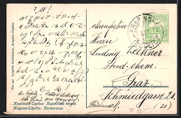 Personenbezogene Daten auf der Rückseite der Karte wurden durch blauen Textmarker unkenntlich gemacht. Die blauen Stellen sind auf die Vorderseite durchgeweicht und wirken sich negativ auf das Postkartenfoto aus