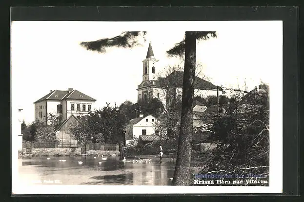 AK Krasna Hora nad Vltavou, Ortspartie mit Teich