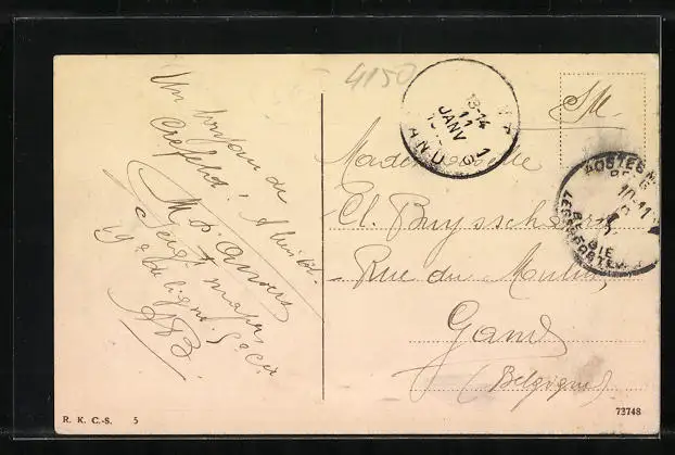 Personenbezogene Daten auf der Rückseite der Karte wurden durch blauen Textmarker unkenntlich gemacht. Die blauen Stellen sind auf die Vorderseite durchgeweicht und wirken sich negativ auf das Postkartenfoto aus