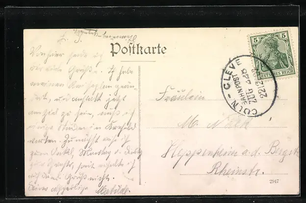 Personenbezogene Daten auf der Rückseite der Karte wurden durch blauen Textmarker unkenntlich gemacht. Die blauen Stellen sind auf die Vorderseite durchgeweicht und wirken sich negativ auf das Postkartenfoto aus