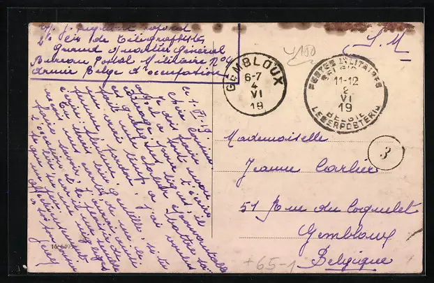 Personenbezogene Daten auf der Rückseite der Karte wurden durch blauen Textmarker unkenntlich gemacht. Die blauen Stellen sind auf die Vorderseite durchgeweicht und wirken sich negativ auf das Postkartenfoto aus