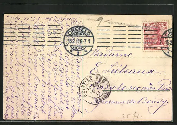 Personenbezogene Daten auf der Rückseite der Karte wurden durch blauen Textmarker unkenntlich gemacht. Die blauen Stellen sind auf die Vorderseite durchgeweicht und wirken sich negativ auf das Postkartenfoto aus