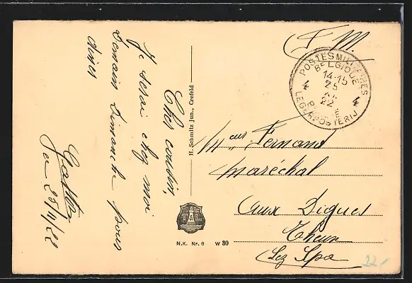 Personenbezogene Daten auf der Rückseite der Karte wurden durch blauen Textmarker unkenntlich gemacht. Die blauen Stellen sind auf die Vorderseite durchgeweicht und wirken sich negativ auf das Postkartenfoto aus