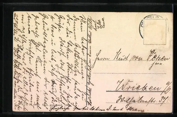 Personenbezogene Daten auf der Rückseite der Karte wurden durch blauen Textmarker unkenntlich gemacht. Die blauen Stellen sind auf die Vorderseite durchgeweicht und wirken sich negativ auf das Postkartenfoto aus