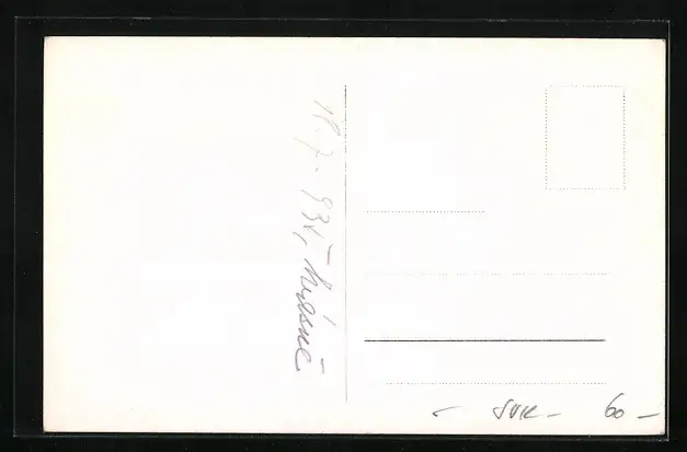 Personenbezogene Daten auf der Rückseite der Karte wurden durch blauen Textmarker unkenntlich gemacht. Die blauen Stellen sind auf die Vorderseite durchgeweicht und wirken sich negativ auf das Postkartenfoto aus