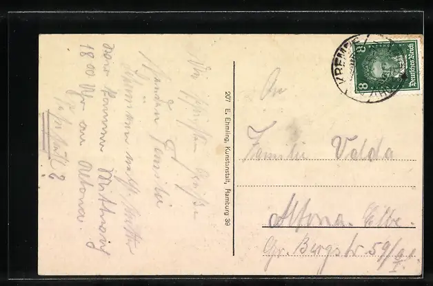 Personenbezogene Daten auf der Rückseite der Karte wurden durch blauen Textmarker unkenntlich gemacht. Die blauen Stellen sind auf die Vorderseite durchgeweicht und wirken sich negativ auf das Postkartenfoto aus